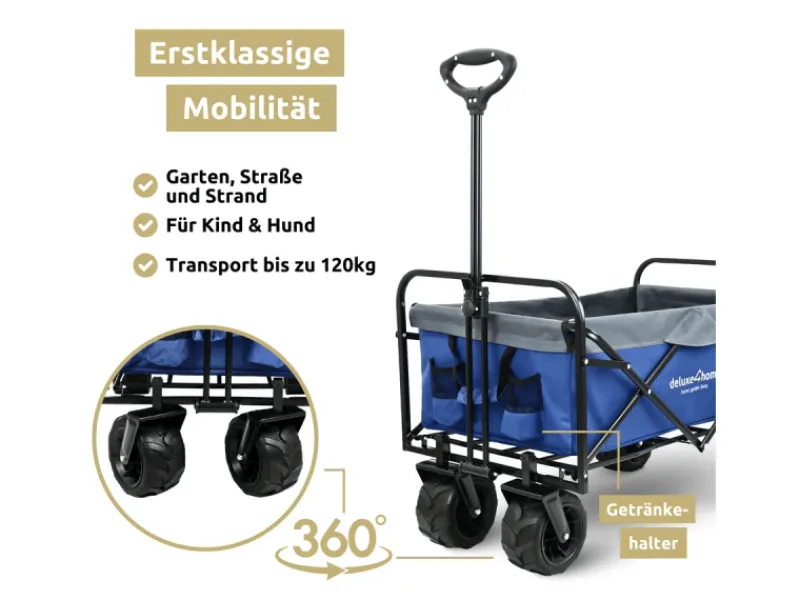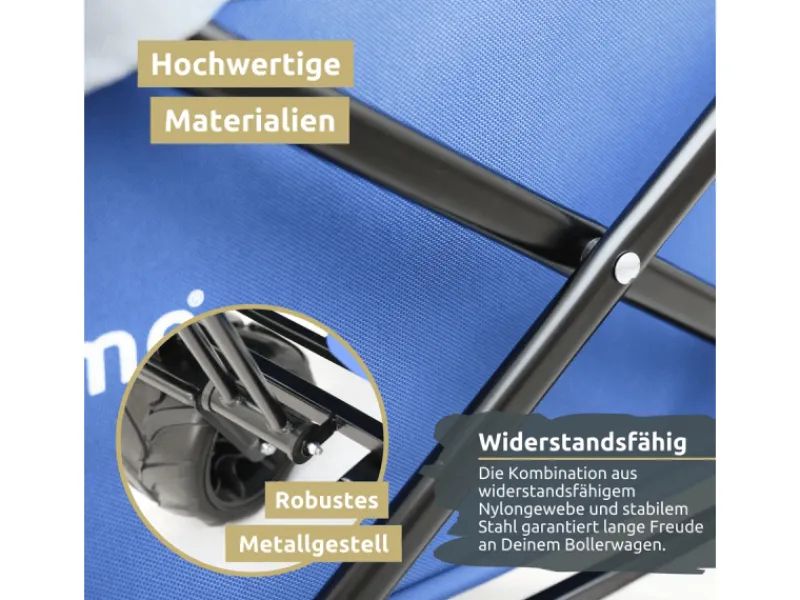 Erlebe ultimativen Komfort und Vielseitigkeit mit unserem faltbaren Bollerwagen mit breiten Reifen! Ob Abenteuer mit den Kindern, Festivals oder Outdoor-Aktivitäten – dieser faltbare Transportwagen ist Dein zuverlässiger Begleiter für jeden Anlass. Seine großzügige Ladefläche bietet reichlich Platz für alles, was Du unterwegs brauchst. Mit diversen Halterungen und Aufbewahrungstaschen für Getränkeflaschen und Co. hast Du stets alles griffbereit.Die extra breiten Räder gewährleisten einen festen Stand, sogar auf weichem Untergrund wie Sand, während die dicke Rahmenpolsterung für Komfort sorgt. Das Highlight? Unser Bollerwagen lässt sich im Handumdrehen zusammenklappen und platzsparend verstauen. Perfekt für unterwegs!Die Ausstattung ist erstklassig: Der große Griff ermöglichet ein bequemes Ziehen oder Schieben, während die 360° drehbaren Räder und die Bremsen für einfache Manövrierbarkeit und Sicherheit sorgen. Robust und stabil gebaut, kann unser Bollerwagen bis zu 120kg tragen. Die hochwertigen Materialien wie das strapazierfähige 600D Oxford Nylon und die stabile Rahmenkonstruktion garantieren Langlebigkeit und Zuverlässigkeit.Ob Camping, Grillparty oder Einkaufsbummel – unser faltbare Bollerwagen mit breiten Reifen ist für jede Unternehmung bereit. Entdecke jetzt die perfekte Kombination aus Funktionalität und durchdachtem Design!