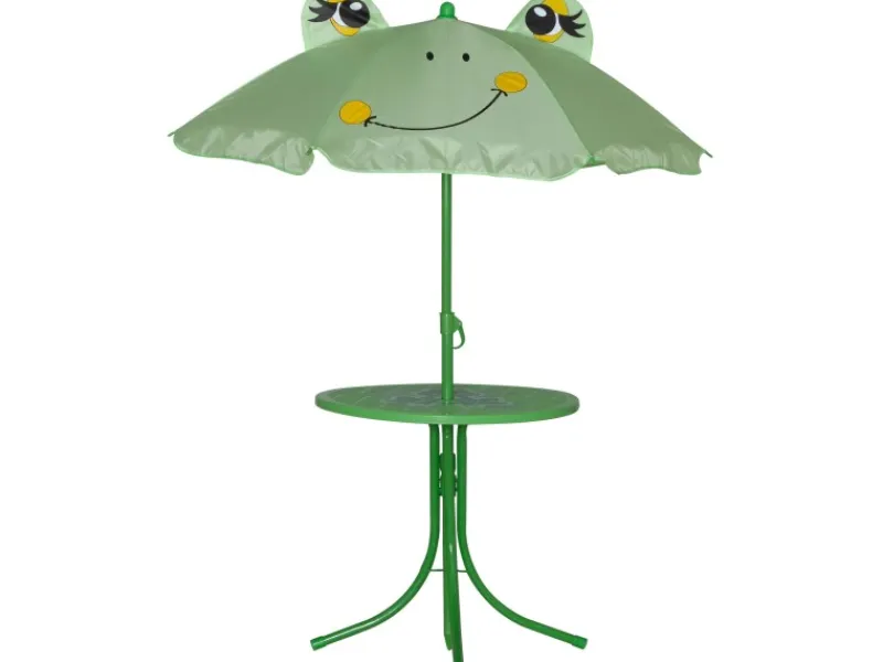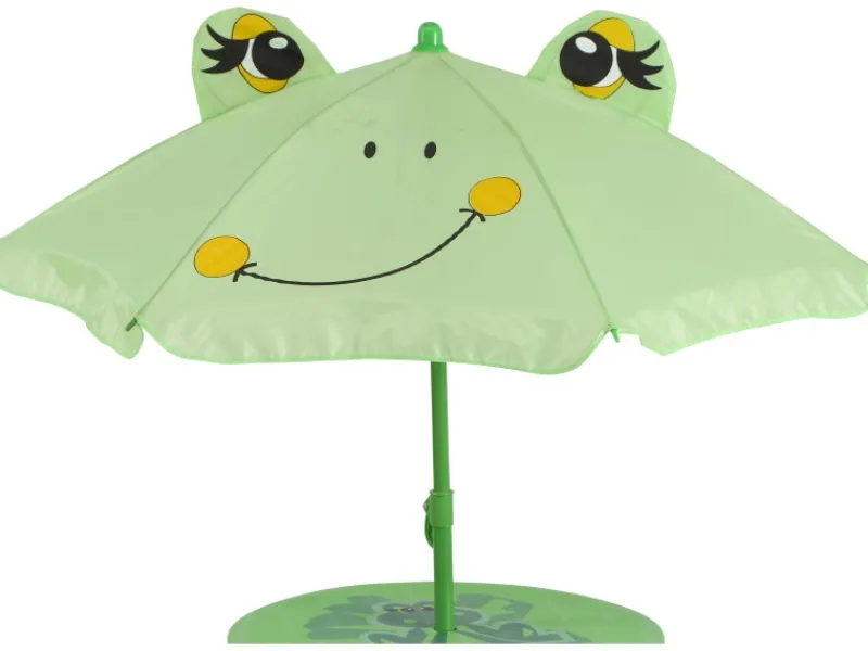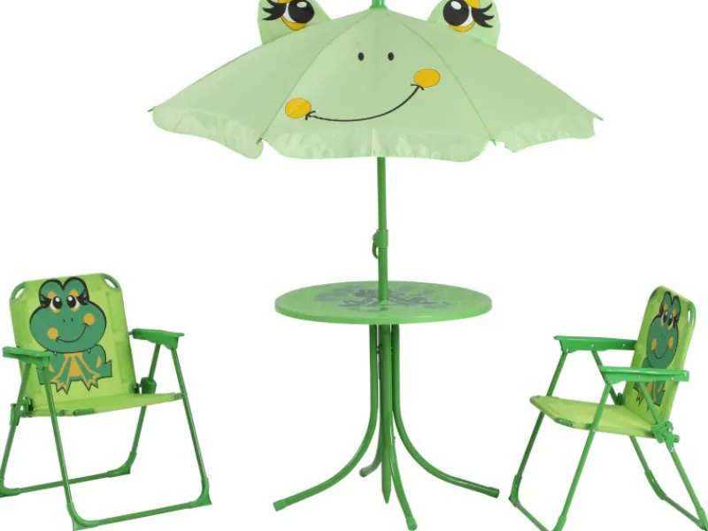 Das Kinderset Froogy mit Frosch-Motiv bestehend aus zwei Sessel, einem Tisch und einem Schirm.