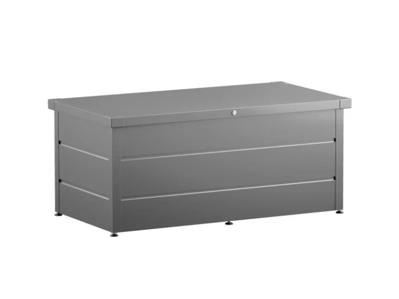 Die EcoStar Gartenbox Elegant in Graualuminium bietet hochwertigen Stauraum für Sitzkissen, Liegeauflagen, Spielzeug und Gartengeräte. Sie ist robust verarbeitet und lässt sich sicher verschließen, um den Inhalt zuverlässig zu schützen.