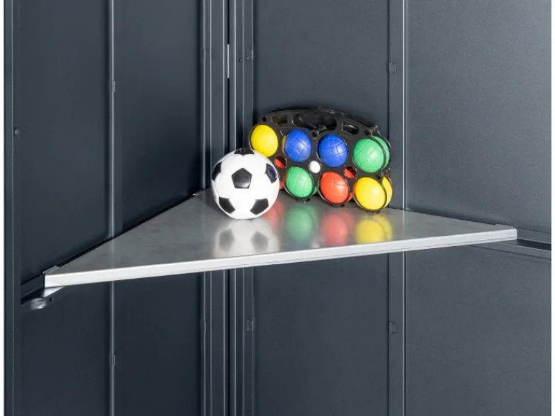 Das EcoStar Eckregal stattet jedes EcoStar Gerätehaus mit einer komfortablen Ablagezone aus. Der feuerverzinkte Dreiecksboden wird ganz einfach eingehakt. Die Ecke zur Platzierung können Sie frei wählen, wobei Sie maximal 2 Eckregale pro Ecke platzieren können.