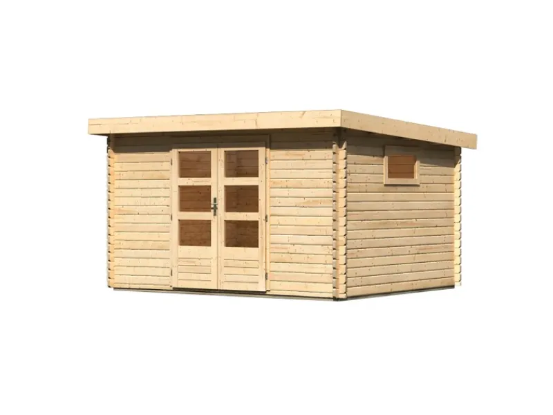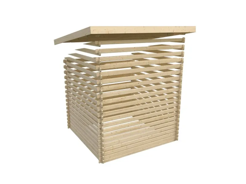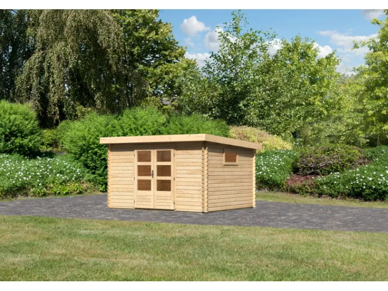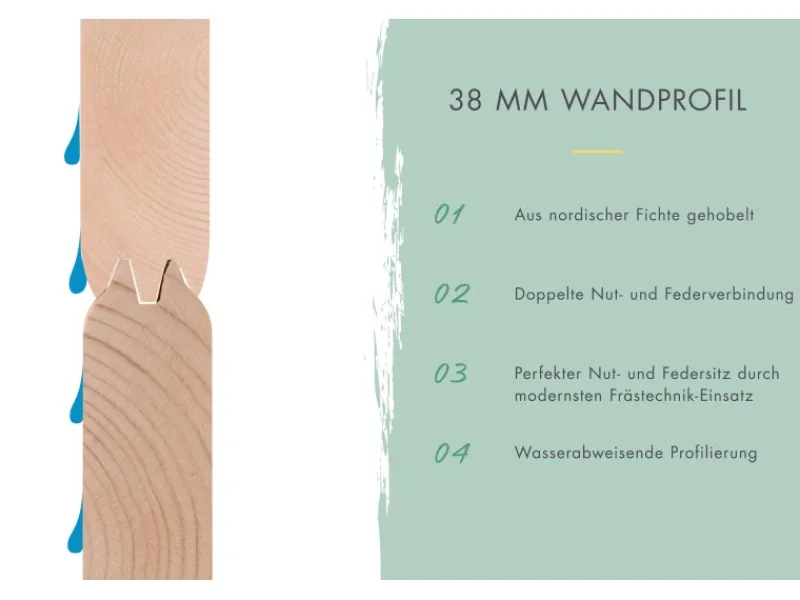 Durch die Doppelnut und -feder sind die Wände extrem stabil. Die in den Eckverbindungen sitzenden Vorbohrungen für die Verschraubung der Blockbohlen sind werkseitig vorgefertigt und verkürzen die Montage enorm. Das Pultdach besteht aus Massivholz.