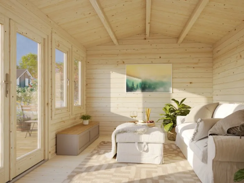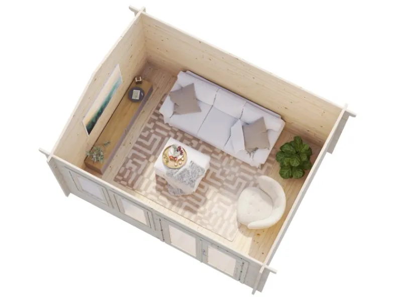 Die Tür- und Fenstersprossen sind inklusive und kann auf Wunsch montiert werden. Zum Bausatz gehören auch imprägnierte Fundamenthölzer, 19 mm Dach- und Fußbodenbretter mit Nut und Feder, Sturmleisten, sowie Montage-Set. Die Dacheindeckung ist nicht im Lieferumfang enthalten. Ab Werk wird das Haus mit einer farbigen Fassade im Grundfarbton dunkelgrau RAL7012 sowie der Akzentfarbe anthrazit RAL7016 versehen. Das Innere des Hauses bleibt naturbelassen.