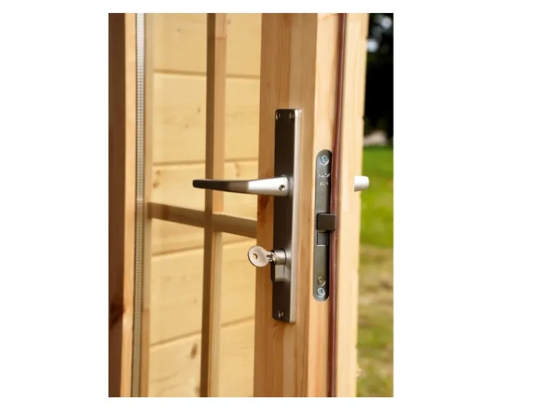 Tür und Fenster mit Isolierglas und Gummidichtung sowie aufgesetztem Sprossenrahmen. Die Tür ist aus Leimholz gefertigt und verfügt über ein Profilzylinderschloss mit 3 Schlüsseln. Die Einzelfenster sind mit einer Aluminium-Abtropfkante und einem Dreh-Kipp-Beschlag ausgestattet, das Öffnungsmaß beträgt 52 x 118 cm.