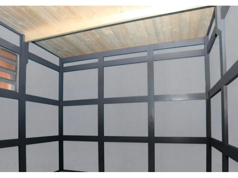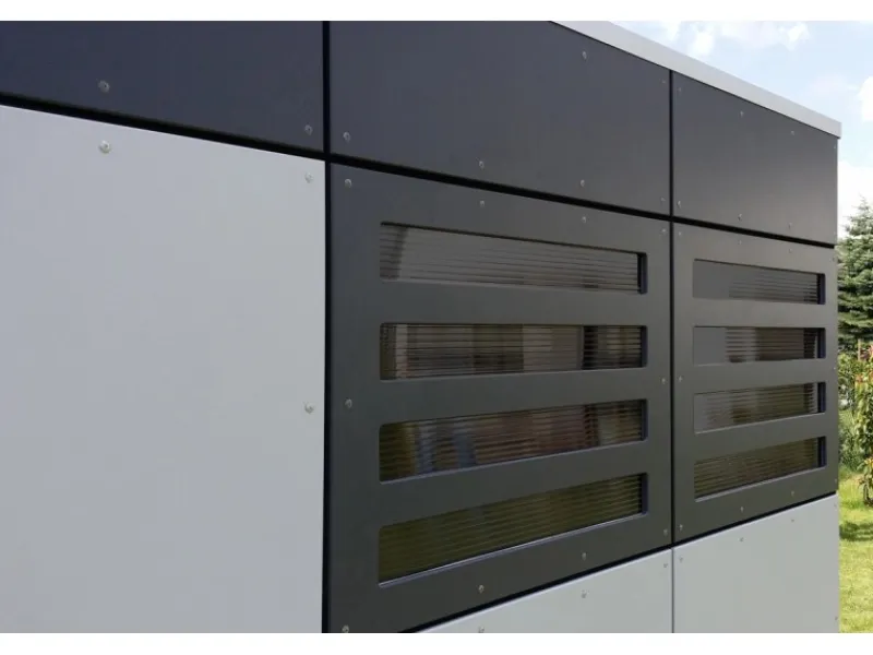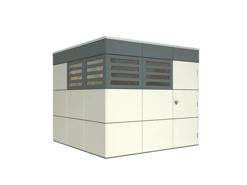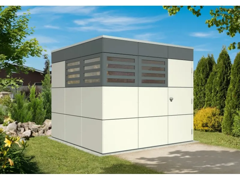 Das Gartenhaus überzeugt durch sein ausgefallenes Design und ist dabei in schlichtem Telegrau gehalten. Es eignet sich besonders zur Aufbewahrung von Gegenständen.