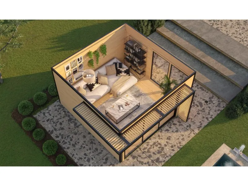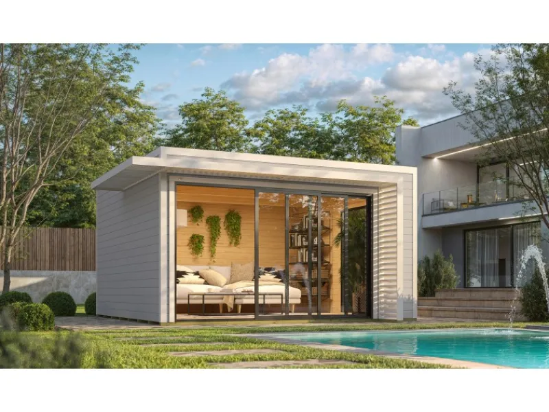 Wenn im Haus kein Platz für ein Home Office ist, stellt diese Variante eine sehr gute Alternative dar. Mit einer Größe von 400 cm × 400 cm und einer Wandstärke von 44 mm bietet dieses Gartenhaus viel Platz. Die dreiflügelige, bodentiefe Schiebetür sowie zwei feststehende Seitenfenster lassen viel Tageslicht ins Innere.
