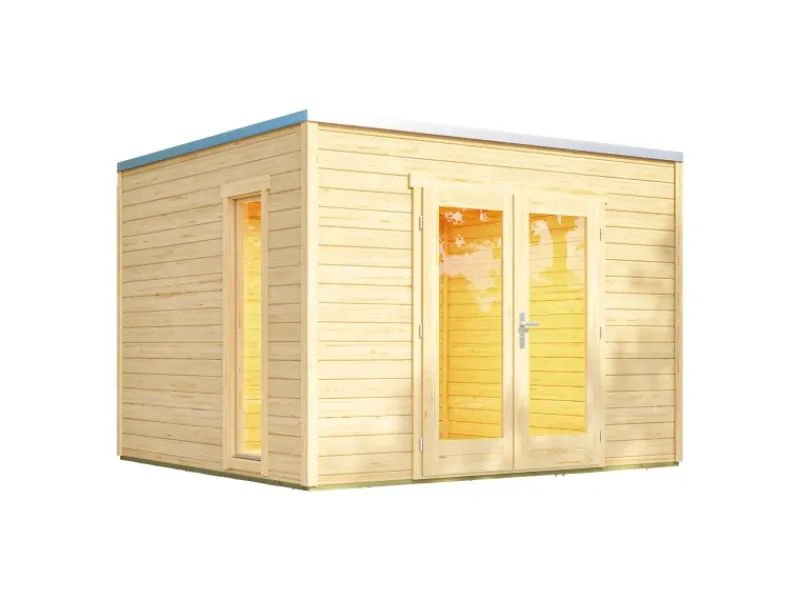 Um lange Freude an Ihrem Gartenhaus zu haben, ist eine Behandlung mit geeigneten Holzschutzmitteln erforderlich. Das moderne Schraubsystem ermöglicht eine einfache Montage, während das nach innen öffnende Seitenfenster und die Panorama-Doppeltür für eine helle und freundliche Atmosphäre im Inneren sorgen.