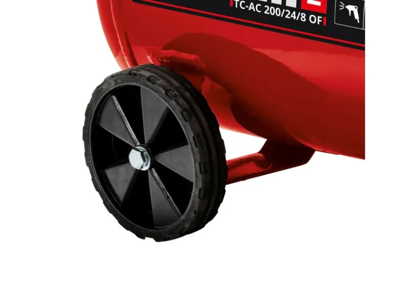 Die Schnellkupplung ermöglicht einen einfachen Wechsel der verschiedenen Druckluftwerkzeuge und bietet zugleich eine sichere Verbindung zum Kompressor. Über eine Entwässerungsschraube kannst du das Kondensat ablassen und so den Kessel vor Rost schützen. Der Luftkompressor verfügt über zwei gummierte Räder und einen Transportgriff, wodurch er sich einfach transportieren lässt. Einen festen Stand bietet der vibrationsgedämpfte Standfuß, während große Räder und ein praktischer Haltebügel einen einfachen Transport ermöglichen. Dank Rückschlag- und Sicherheitsventil ist für deine Sicherheit bei der Benutzung gesorgt.