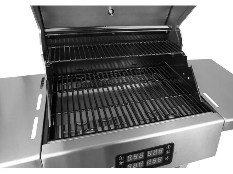 Der Landmann E-Grillwagen mit zwei separaten Heizelementen besitzt ein digitales Temparaturdisplay mit Touch Screen und einen Unterschrank inklusive mittlerem Board zum Ablegen und Verstauen von Zubehör.