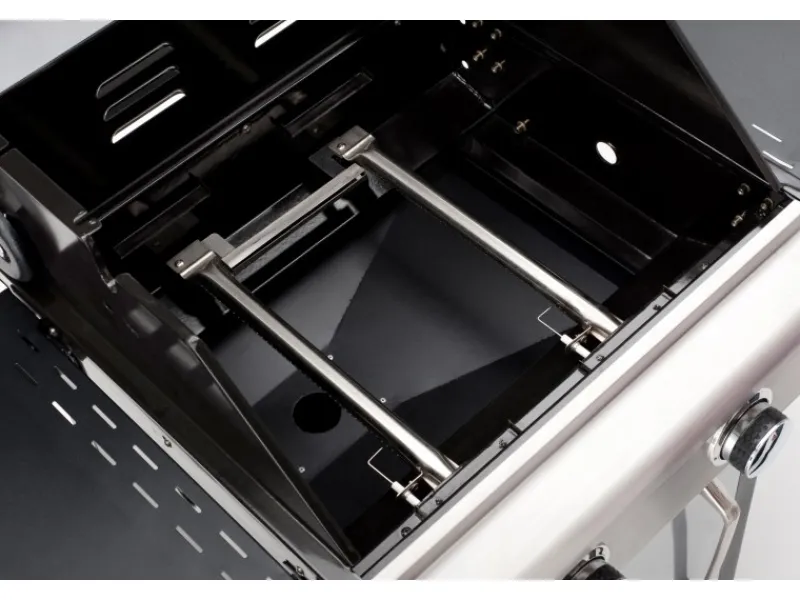 Die beiden Seitenflächen bieten ausreichend Platz. Stellen Sie Ihre Gewürze, Zutaten oder Geschirr bequem auf der zusätzlichen Arbeitsfläche ab. Für eine platzsparende Unterbringung lassen sich die Seitenflächen klappen. Die zwei Edelstahl-Brenner mit einer Leistung von je 3,5 kW sind stufenlos regulierbar. Dank der doppelwandigen Haube gelingt die Hitzeisolierung zuverlässig. Die emaillierte Feuerschale ist außerdem sehr hitzebeständig.