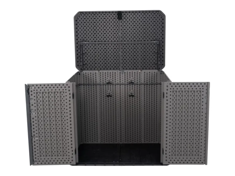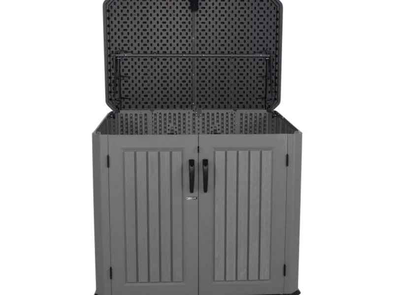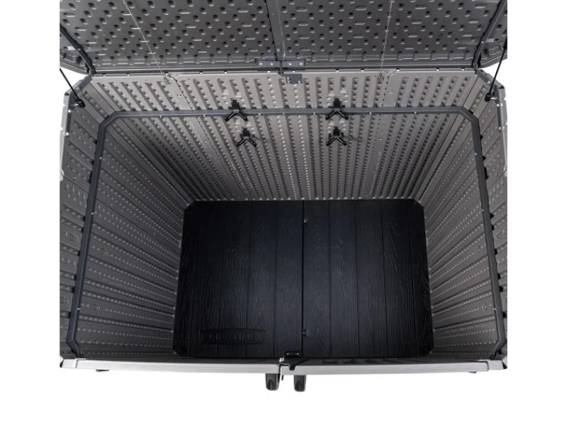 Kaum ein Gegenstand des täglichen Gebrauchs ist so essenziell, gleichzeitig aber optisch so unbeliebt wie die Mülltonne. Mit der Mülltonnenbox Phil von Lifetime knüpfen wir genau an dieses Problem an! Die Mülltonnenbox lässt problemlos 2 Mülltonnen hinter einem Korpus aus hochwertigen Kunststoff-Wabenplatten verschwinden. Neben der sichtbaren Aufwertung der Mülltonnen hält die Box die Sonneneinstrahlung fern, und beugt somit intensiver Geruchsentwicklung vor. Beide Fronttüren und der Deckel der Mülltonnenbox lassen sich vollständig öffnen – somit kannst du die Mülltonnen problemlos in die Box schieben, und dort rangieren. Am Deckel der Mülltonnenbox befinden sich 2 Ketten-Aufhängungen, an denen du die Deckel der Mülltonnen befestigen kannst. Zwei Gasdruckdämpfer halten den Deckel der Mülltonnenbox aufrecht, und verringern so das Verletzungsrisiko. Alternativ kannst du die Mülltonnenbox auch als Gartenschrank oder Geräteschuppen verwenden, und im Handumdrehen für Ordnung auf deinem Grundstück sorgen.