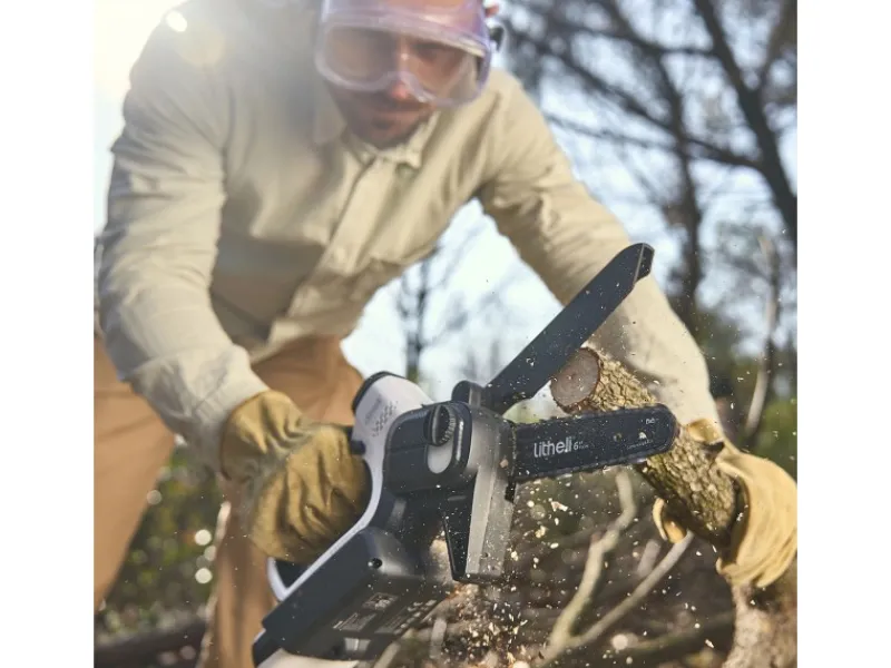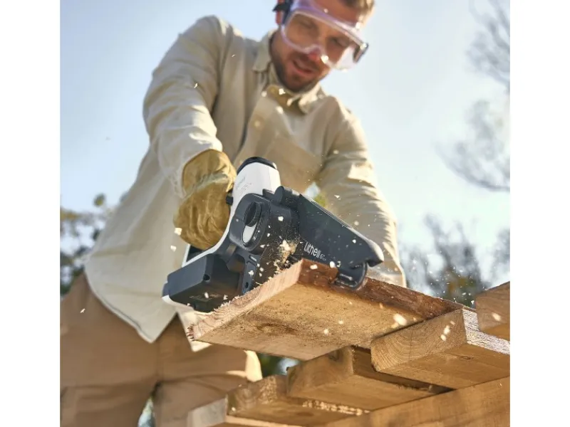 Der Doppelsperrschalter erhöht die Sicherheit während des Betriebs. Der ergonomische und gummierte Griff gibt dir einen bequemen, rutschfesten Halt und reduziert die Vibrationen. Die Akku-Kettensäge ist leicht und kompakt und daher ein guter Begleiter bei Camping-Ausflügen.