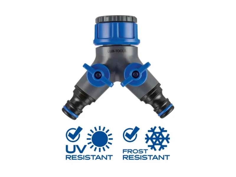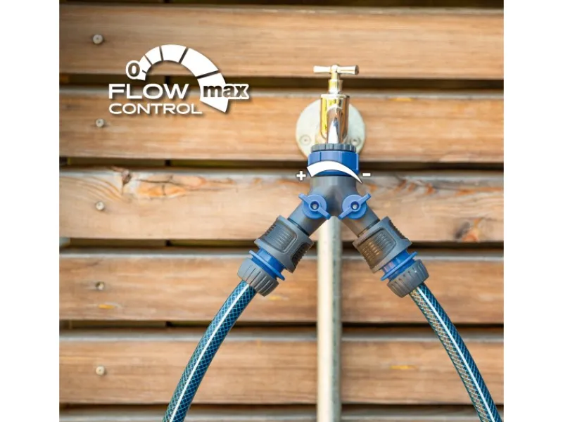 Dank der verzweigten Y-Form lassen sich zwei Schläuche anschließen, ohne dass der Platz zu eng wird. Zudem können Sie die Wasserdurchflussmenge für jeden Anschluss individuell steuern. Dazu ist das Flow-Control-System integriert. Das Ventil ist hochwertig aus robustem Kunststoff ausgeführt. Es punktet durch seine langlebigen und wasserabweisenden Eigenschaften. Zudem zeichnet sich das Material durch UV- und Frostbeständigkeit aus.