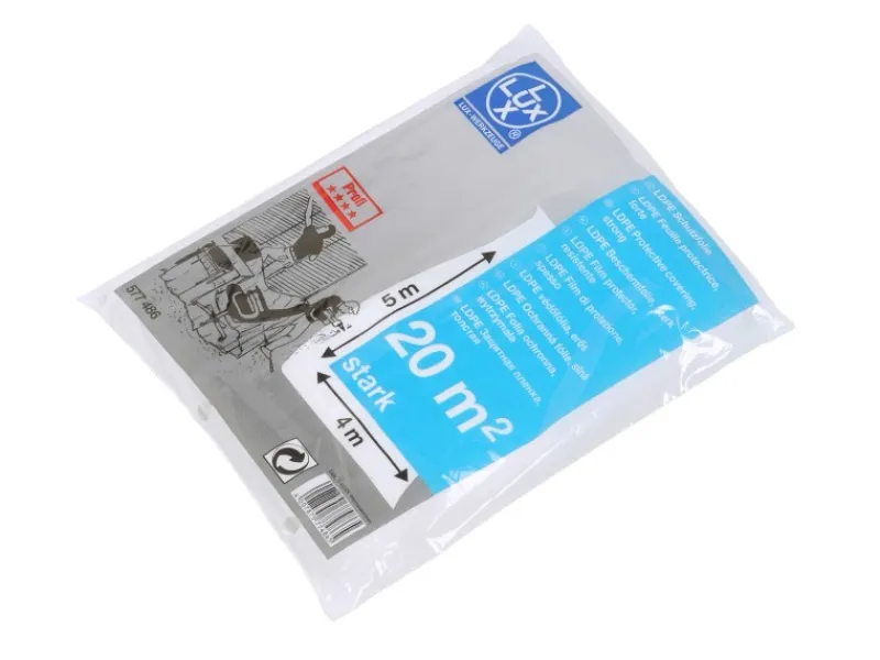 Die LUX-TOOLS Abdeckplane 4 m x 5 m hat eine leichte Dichte an PE-Kunststoff (Polyethylen). Sie eignet sich besonders gut zum Schutz vor Farbe, Schmutz und Nässe. Die Plane hat eine Fläche von 20 m². Foliengewicht: 437 gramm