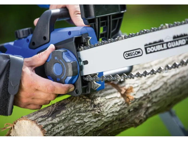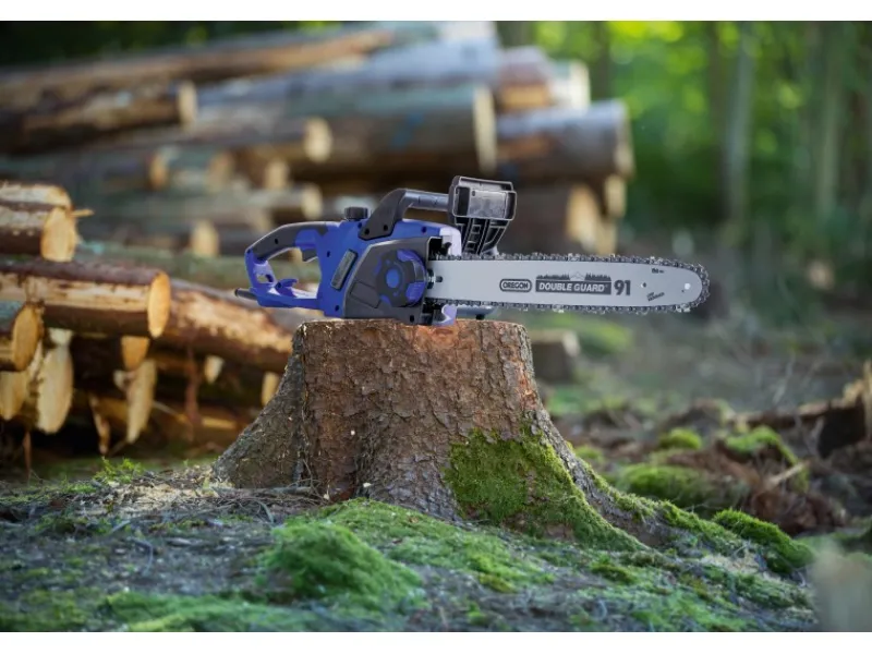 Dank des fehlenden Benzintanks kann die Kettensäge durch ihr geringes Gewicht punkten. Sie ist ausgestattet mit einer automatischen Kettenschmierung und einem Umlenkstern. Dieser gewährleistet eine optimale Haftung der Kette an der Führungsschiene und verhindert das Abrutschen der Kette. Das Vollmetallgetriebe macht die Elektro-Kettensäge besonders robust und langlebig. Der werkzeuglose Wechsel der Schneidgarnitur und der Überlastungsschutz bieten ideale Sicherheit.