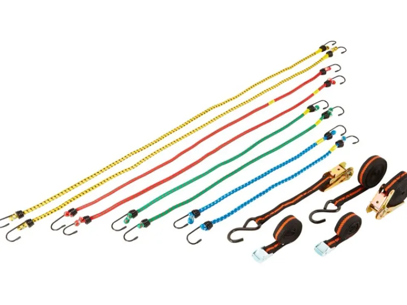 Außerdem beinhaltet das Set 8 Gummi-Expander mit Metallhaken, jeweils 2 Stück in den Größen Ø 8 mm x 40 cm, Ø 8 mm x 60 cm Ø 8 mm x 80 cm und Ø 8 mm x 100 cm.