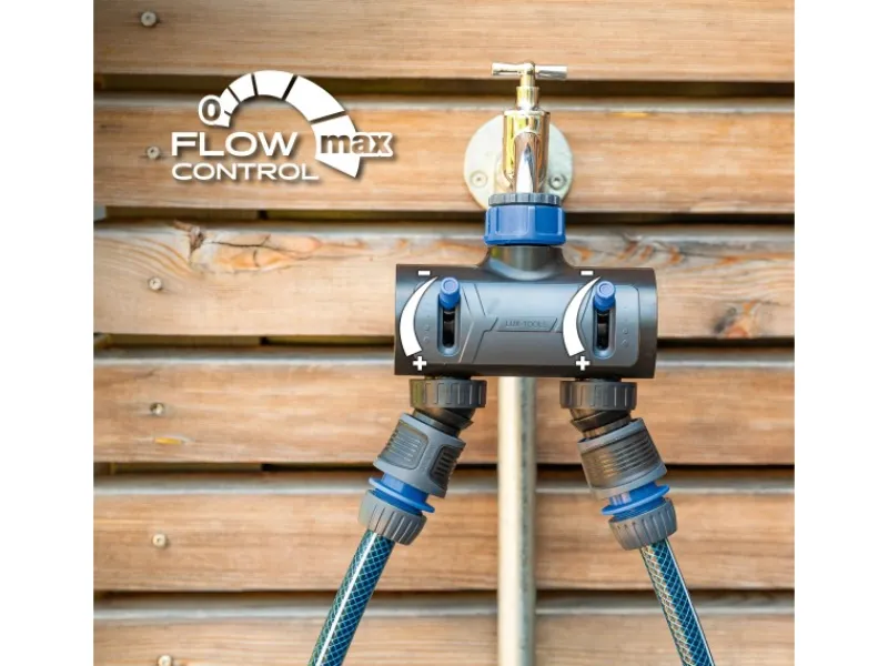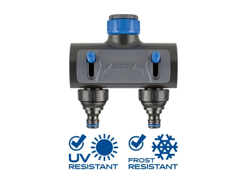 Geeignet ist der Verteiler für einen Hahnanschluss der Größe 26,4 mm (G 3/4). Die beiden Schlauchanschlüsse besitzen je einen Ø von 33,3 mm (G 1). Die entsprechenden Schnellverschlüsse gehören zum System. Gefertigt ist die Schlauchverzweigung aus hochwertigem Kunststoff. Sie zeichnet sich durch UV-beständige und frostsichere Eigenschaften aus.