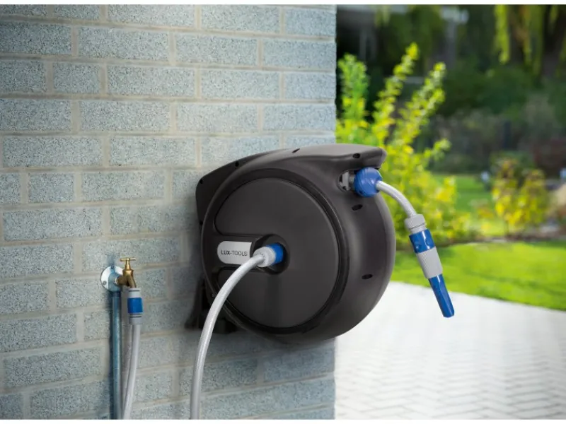 Der integrierte Schlauch aus stabilem Kreuzgewebe hat eine maximale Ausziehlänge von 20 m und einen Ø von 13 mm (1/2″“). Er ist für einen Druck von maximal 6 bar ausgelegt. Darüber hinaus verfügt die Wandschlauchtrommel über eine 2 m lange Zuleitung, die ebenfalls aus Kreuzgewebe besteht. An den Bewässerungsschlauch können Sie auch andere Wasserverbraucher wie beispielsweise Rasensprenger und Hochdruckreiniger anschließen.