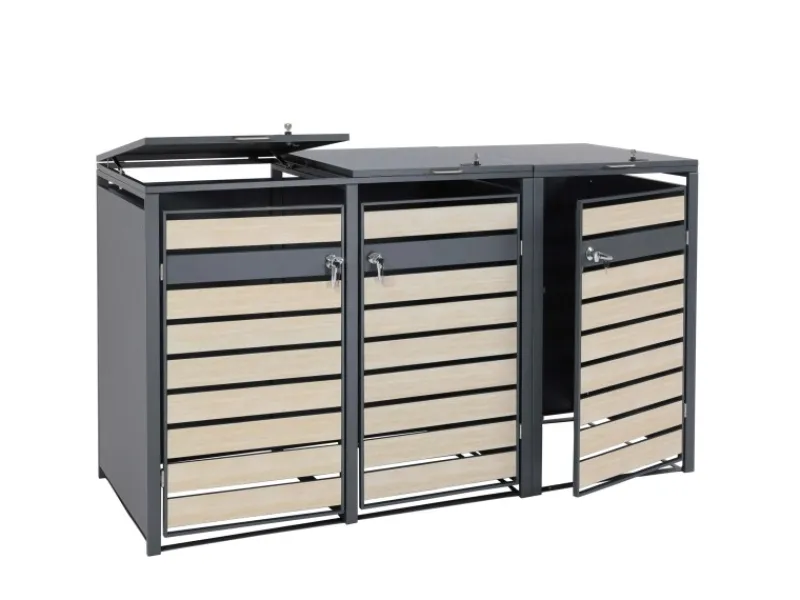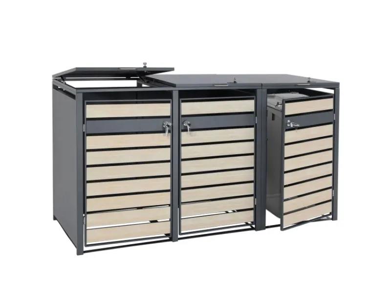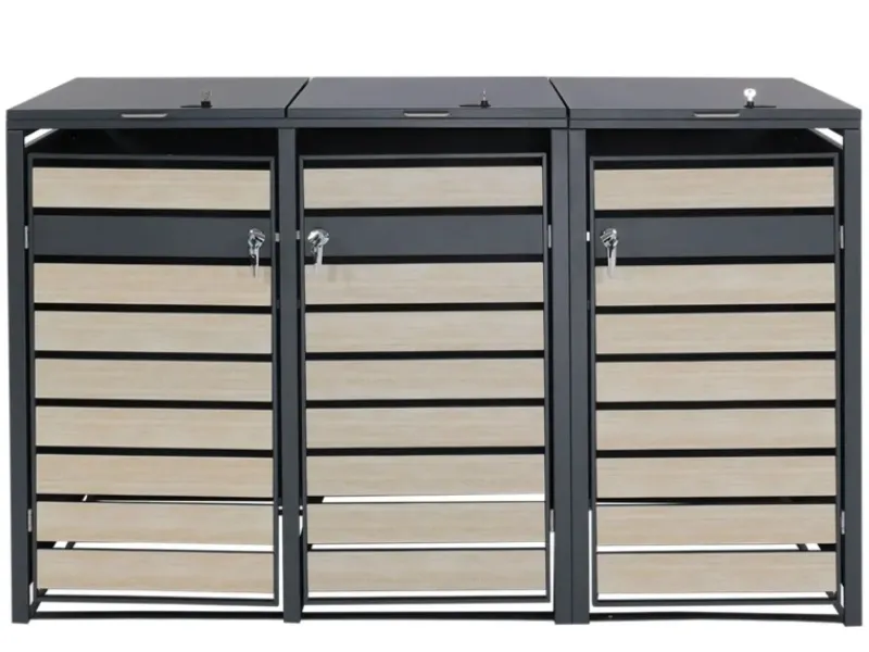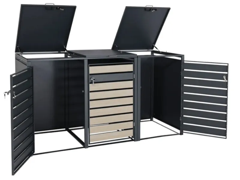 – Diese moderne Mülltonnenverkleidung ist nicht nur optisch ansprechend. Neben den abschließbaren Türen und einem sehr stabilen Gehäuse, sind die Deckel dieser Mülltonnenverkleidung mit Gasdruckfedern ausgestattet.
