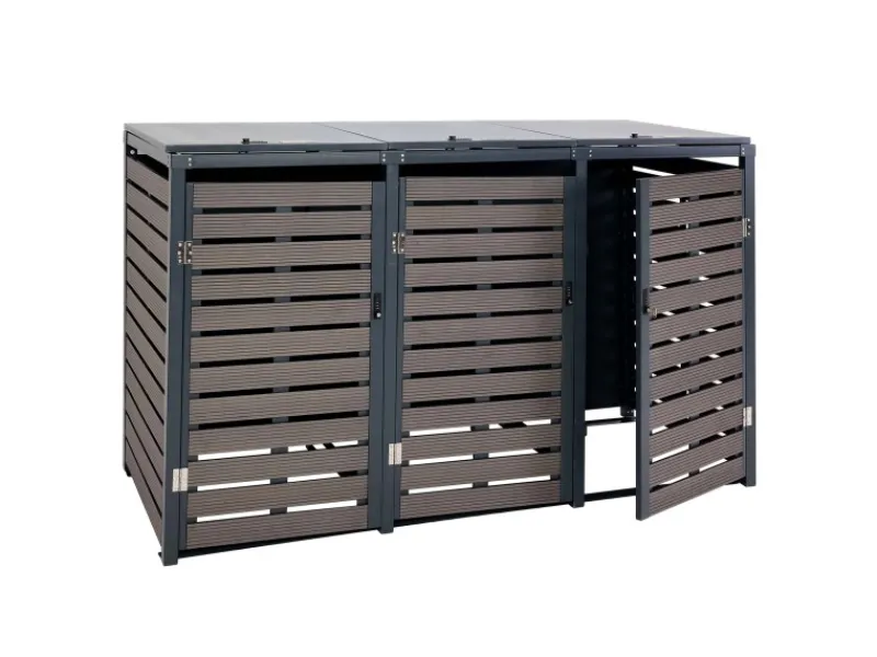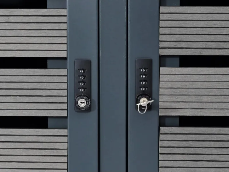 Die Mülltonnenbox ist für handelsübliche Mülltonnen mit einem Fassungsvermögen von 80 bis 240 Litern ausgelegt. Bitte messen Sie im Zweifelsfall Ihre Mülltonne vorher aus. Dieser Mülltonnenschrank ist ideal um gelbe Säcke und Ihre Mülltonne sicher vor Wind aufzubewahren. Die Türen und Deckel sind getrennt abschließbar: sie verfügen über ein Zahlenschloss, das individuell mit einem 4-stelligen Sicherheitscode eingestellt werden kann.