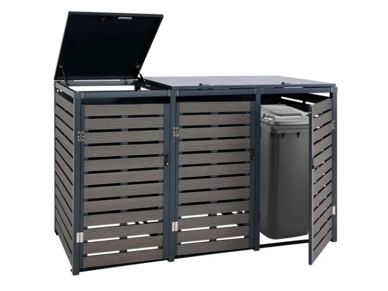 – Diese moderne Mülltonnenverkleidung ist nicht nur optisch ansprechend. Neben der abschließbaren Tür und einem sehr stabilen Gehäuse, ist der Deckel dieser Mülltonnenverkleidung mit Gasdruckfedern ausgestattet.