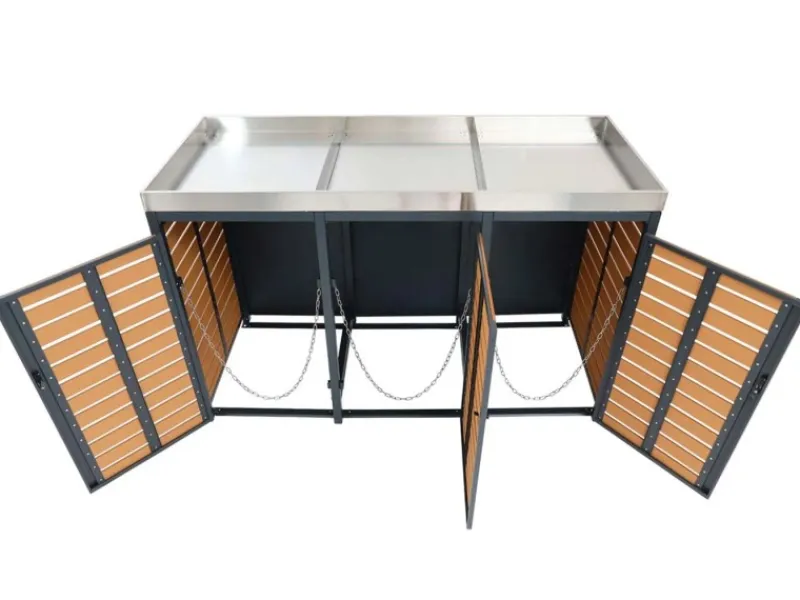 – Diese moderne Mülltonnenverkleidung mit Pflanzkasten ist nicht nur optisch ansprechend. Neben den abschließbaren Türen und dem stabilen Gehäuse, ist der Pflanzkasten mit Ablauflöchern für überflüssiges Wasser ausgestattet.
