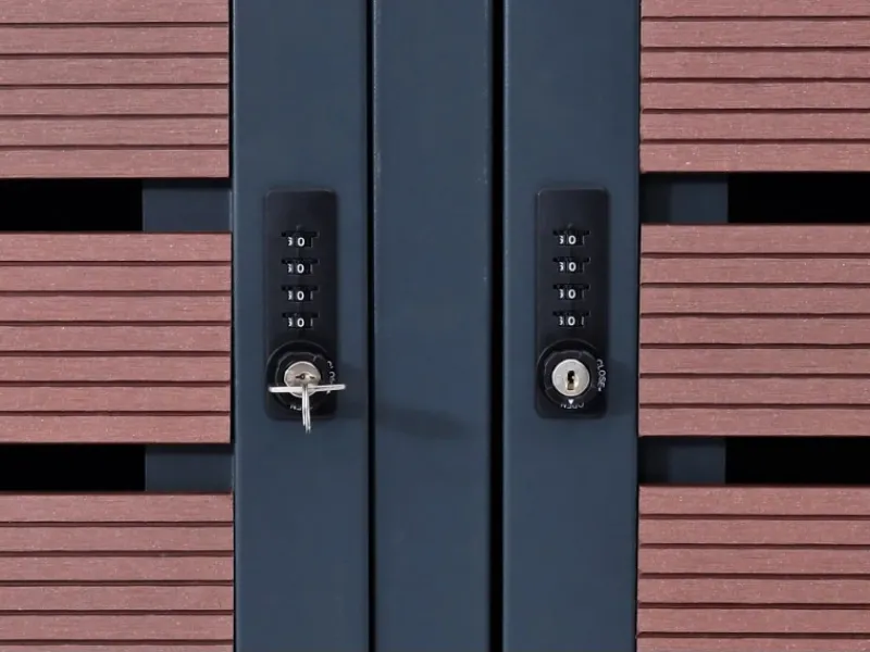 Die Mülltonnenbox ist für handelsübliche Mülltonnen mit einem Fassungsvermögen von 80 bis 240 Litern ausgelegt. Bitte messen Sie im Zweifelsfall Ihre Mülltonne vorher aus. Dieser Mülltonnenschrank ist ideal um Gelbe Säcke und Ihre Mülltonne sicher vor Wind aufzubewahren. Dank der Kippvorrichtung wird die Müllentsorgung zum Kinderspiel: einfach die Mülltonne über die Kette kippen, so können Sie ohne großen Aufwand Ihre Mülltonne befüllen. Die Türen sind getrennt abschließbar: sie verfügen über ein Zahlenschloss, das individuell mit einem 4-stelligen Sicherheitscode eingestellt werden kann. Dank der Ablauflöcher kann überflüssiges Wasser von dem Pflanzkasten ablaufen. Durch die Belüftungsschlitze wird Kondensatbildung verhindert.