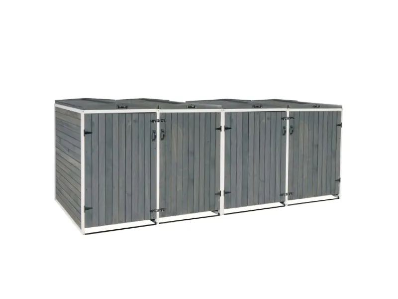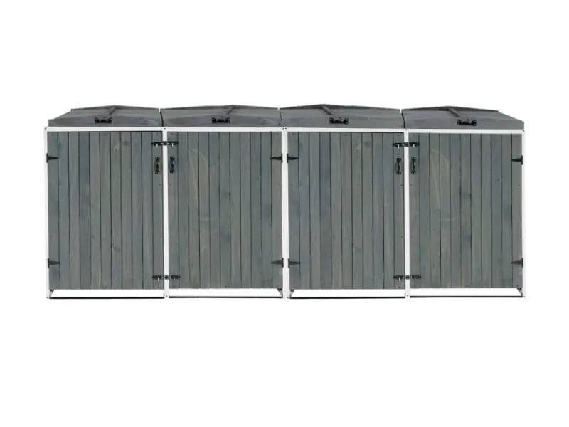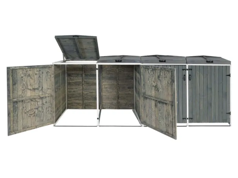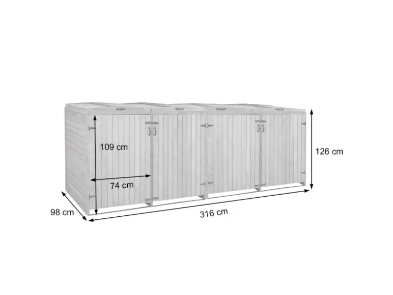 Zwischen den einzelnen Abteilen einer 2er-Mülltonnenverkleidung gibt es eine Trennung. Jedes Abteil ist für handelsübliche Mülltonnen mit einem Fassungsvermögen von 80 bis 240 Litern ausgelegt. Der Deckel ist mit einer Halterung ausgestattet, damit bleibt er offen stehen und erleichtert Ihnen das Befüllen der Mülltonnen. Beide Deckel sind außerdem mit einer Wind-Sicherung durch Ketten ausgestattet. Durch die vier Griffe wird Ihnen das Öffnen und Schließen der Deckel und Türen erleichtert. Beide Türen verfügen jeweils über zwei Riegelschlösser. Da die Rückwand verkleidet ist, kann der Mülltonnenschrank auch frei aufgestellt werden. Bei Holz handelt es sich um ein Naturprodukt. Wir empfehlen Ihnen dieses in regelmäßigen Abständen neu zu behandeln, um es vor Witterungseinflüssen zu schützen.