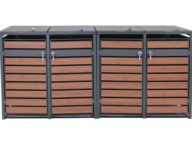 – Diese moderne Mülltonnenverkleidung ist nicht nur optisch ansprechend. Neben den abschließbaren Türen und einem sehr stabilen Gehäuse, sind die Deckel dieser Mülltonnenverkleidung mit Gasdruckfedern ausgestattet.