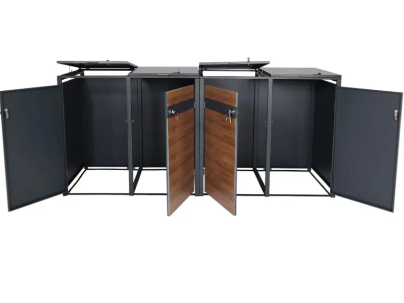 – Diese moderne Mülltonnenverkleidung ist nicht nur optisch ansprechend. Neben den abschließbaren Türen und einem sehr stabilen Gehäuse, sind die Deckel dieser Mülltonnenverkleidung mit Gasdruckfedern ausgestattet.