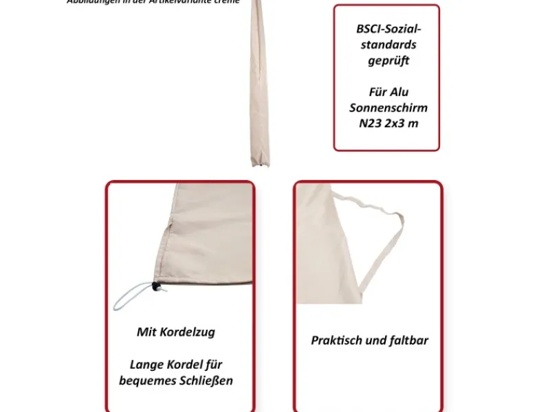 Die ersten Tropfen fallen vom Himmel und Sie klappen einfach, ganz entspannt, Ihren Schirm zusammen, stülpen die Plane darüber und schon ist das Prachtstück wetterfest gemacht. Eine schlichte und praktische Ergänzung, ist die Kordel, die Ihre Abdeckhaube auch bei Wind Haltung wahren lässt, sodass sie auch weiterhin Ihren Schirm vor Regen schützt und nicht den nächstbesten Baum.