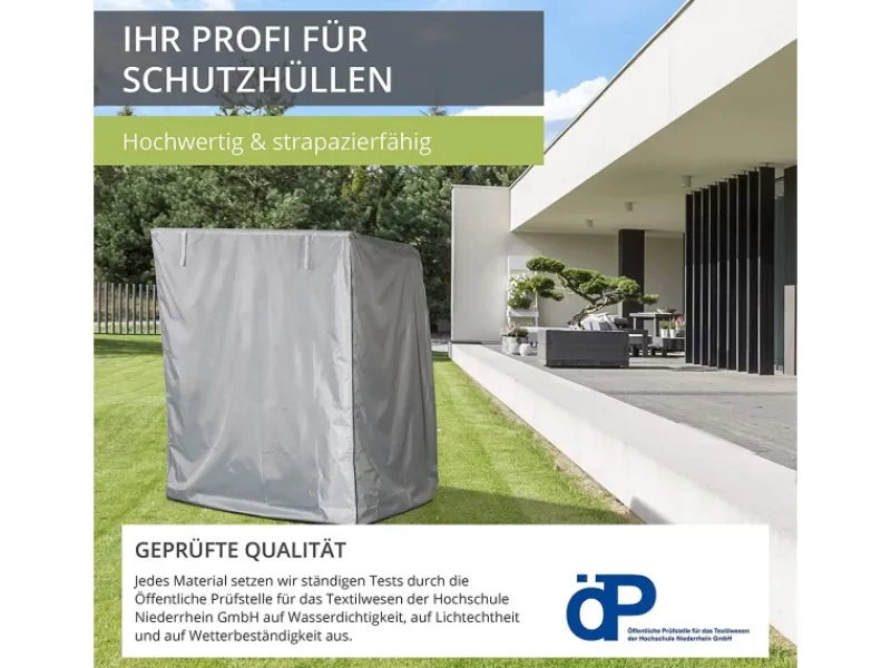 WASSERDICHT & ATMUNGSAKTIV: 3-lagiges Polyestergewebe mit TPU- und innenseitiger Textil-Beschichtung + versiegelten Nähten ist wasserdicht und kann im Innern auftretende Feuchtigkeit nach außen abgeben, um Kondenswasser/Schimmelbildung vorzubeugen UV-BESTÄNDIG: Hohe Farbechtheit dank durchgefärbtem Gewebe schützt vor Verschleiß sowie Ausbleichen der Abdeckung und bewahrt Ihren Strandkorb vor UV-Strahlung GEPRÜFTE QUALITÄT: Das Material der Strandkorbhülle wird regelmäßig durch die öffentliche Prüfstelle für das Textilwesen der Hochschule Niederrhein GmbH auf Wasserdichtigkeit, Lichtechtheit und Wetterbeständigkeit getestet LEICHTE HANDHABUNG: Einfach über den Strandkorb stülpen, die Reißverschlüsse schließen und die Kordel festziehen. Sie können die Front aufrollen und mit den Klettverschlüssen befestigen, um ohne Abziehen der gesamten Hülle im Strandkorb zu verweilen LANGLEBIG & FROSTBESTÄNDIG: Unsere Strandkorb-Abdeckung bleibt auch bei niedrigen Temperaturen flexibel und bricht nicht