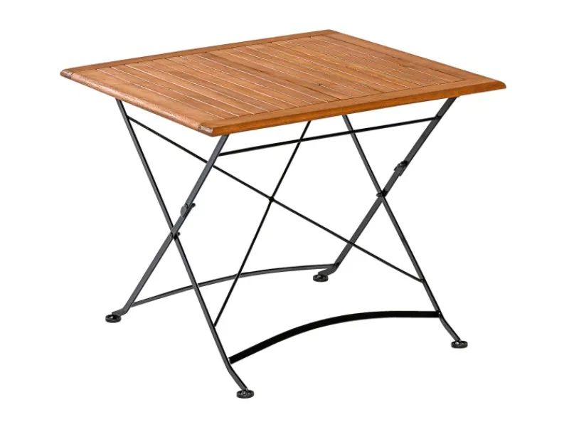 Durch die praktische Klappfunktion kann der Tisch ganz einfach zusammengeklappt werden. In wenigen Handgriffen ist er somit auf- oder abgebaut und stets einsatzfähig. Durch das robuste Gestell aus Stahl kann der Tisch bedenkenlos im Außenbereich positioniert werden.