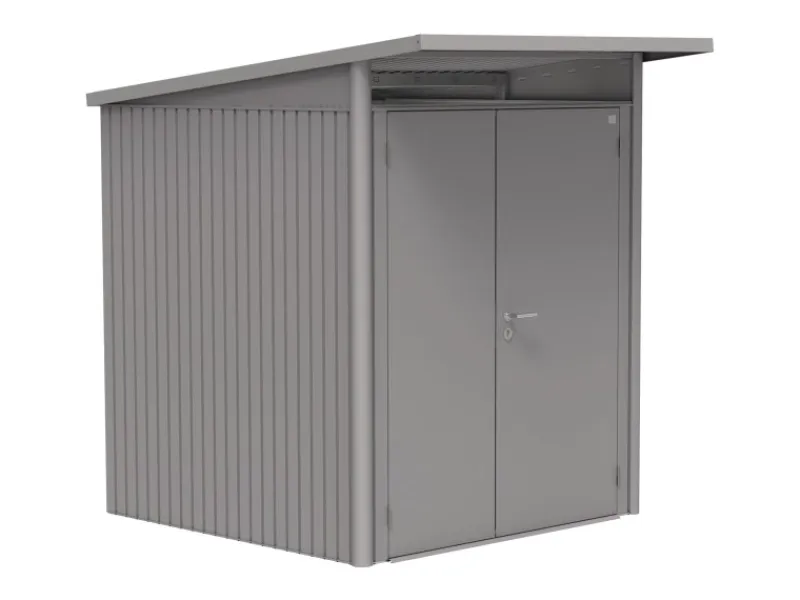 Das Gerätehaus aus Metall überzeugt durch sein ansprechendes Design und ist dabei in schlichtem Quarzgrau-Metallic gehalten.