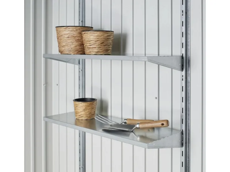 In der komfortablen Grundausstattung sind bereits zwei Regalböden mit entsprechenden Wandschienen enthalten. Hier können Sie beispielsweise Pflanzerde, Töpfe oder kleine Handwerkzeuge ablegen. Vier zusätzliche Gerätehalter dienen zum geordneten Aufhängen von Rechen, Spaten oder Schläuchen. Für die Innenseite der Türen sind zudem zwei Werkzeughalter enthalten.