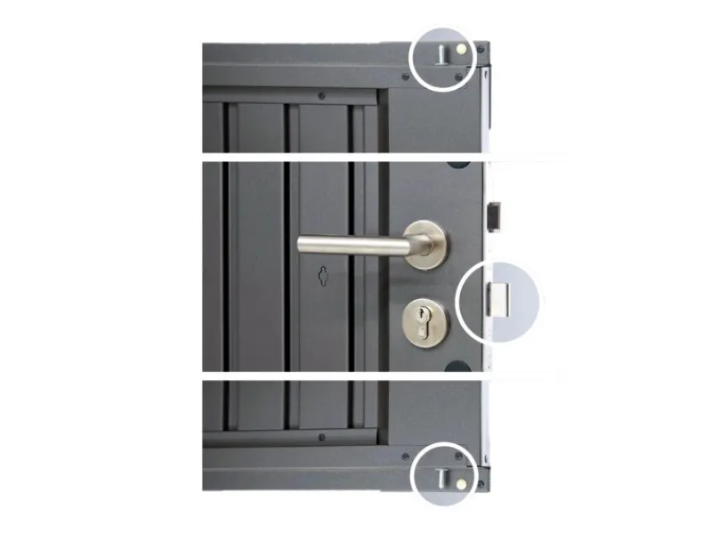 Damit genügend Tageslicht einfallen kann, ist der moderne Schuppen mit Oberlichtern aus Acrylglas ausgestattet. Integrierte Ventilationsschlitze sorgen zudem für eine ausreichende Belüftung. Für ein bequemes Betreten auch mit größeren Geräten, verfügt das Gerätehaus über eine breite Doppeltür mit moderner Edelstahl-Drückergarnitur. Mit einer Dreifach-Verriegelung ist diese auch abschließbar. Gasdruckfedern vereinfachen das Öffnen und Schließen. Die Dachrinnen sind an den Seiten angebracht und verfügen über einen 5/4″-Gartenschlauchanschluss sowie integrierte Laubfänger.