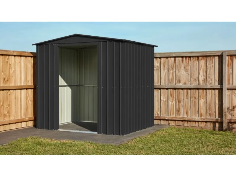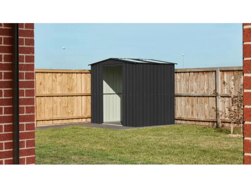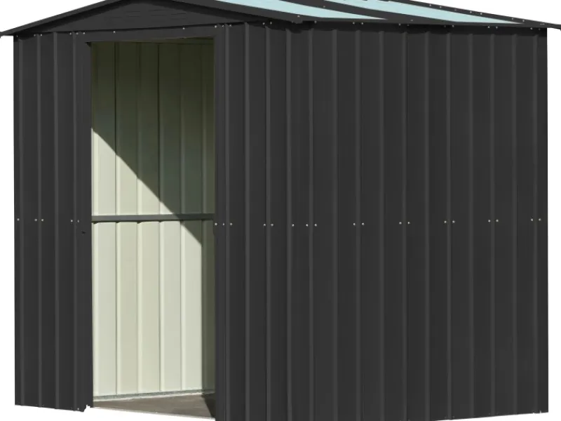 Das Gerätehaus aus Metall überzeugt durch seine ansprechende Optik und ist dabei in schlichtem Anthrazit gehalten.