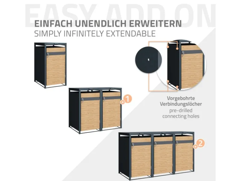 Die Seitenwände der Mülltonnenbox verfügt über Bohrungen, die es dir ermöglichen weitere Boxen an die bestehende anzuschließen. So kannst du die Mülltonnenbox unendlich oft erweitern.