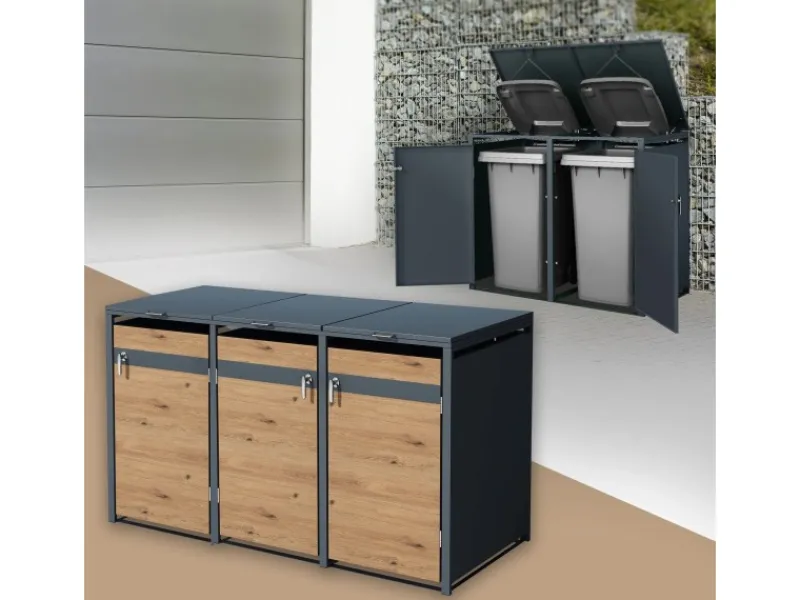 Mülltonnen im Eingangsbereich machen oftmals keine schöne Figur. Mit den praktischen Mülltonnenboxen hast du eine smarte und komfortable Lösung, die unschönen Mülltonnen verschwinden zu lassen. Die Mülltonnenboxen sorgen für Ordnung und bieten zusätzlich noch Schutz vor Fremdeinflüssen. Es passen alle gängigen Mülltonnen von 60 Liter, 120 Liter oder 240 Liter.
