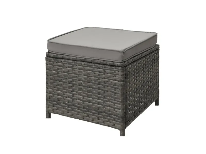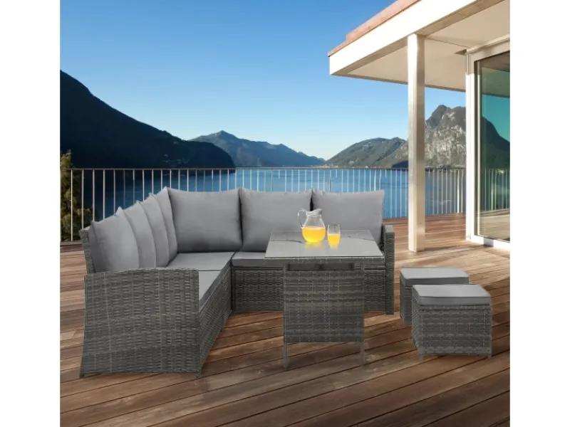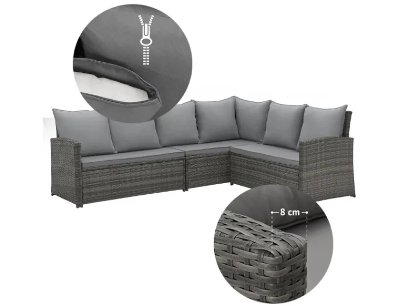Die gut gepolsterten Auflagen und die sieben dazugehörigen Kissen in Grau sorgen für hohen Sitzkomfort und lassen sich dank der abnehmbaren Bezüge mühelos in der Waschmaschine reinigen.