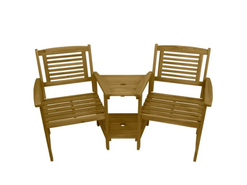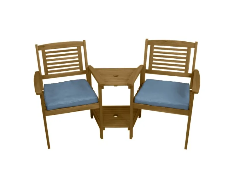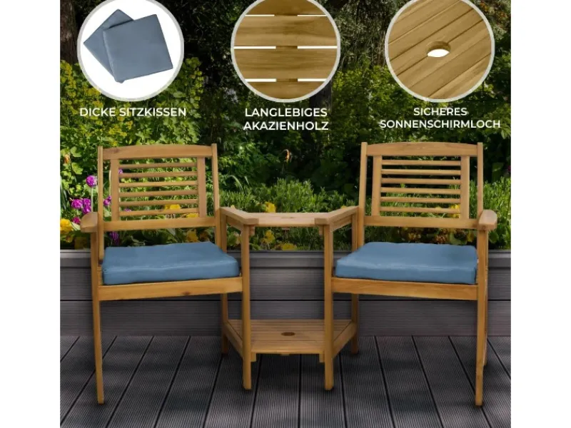 Mit dieser praktischen Gartenbank aus Holz können Sie Ihren Garten perfekt vervollständigen, um wertvolle Zeit mit einem geliebten Menschen zu genießen.Diese Gartenbank ist durch einen fächerförmigen Tisch verbunden, der sie leicht zueinander neigt, um eine persönlichere Atmosphäre zu erzeugen. Der Tisch verfügt über zwei Ebenen und bietet reichlich Platz für Getränke, Snacks und alles, was Sie sonst noch mitbringen möchten, während Sie sich in der Sonne entspannen. Ein integriertes Loch mit einem Durchmesser von 5 cm in der Mitte des Tisches bietet Ihnen die Möglichkeit, einen Sonnenschirm aufzustellen, um einen kühlen, schattigen Sitzbereich zu erhalten.Diese Sitzbank ist aus hochwertigem Akazienholz gefertigt und wird sich im Laufe der Zeit bewähren. Die harte Natur dieses Materials macht Ihre Bank unglaublich langlebig und bemerkenswert widerstandsfähig gegenüber den Elementen und starker Beanspruchung. Die atemberaubende, geölte Oberfläche verleiht der Sitzbank eine warme Ausstrahlung und ist die perfekte Ergänzung für Ihren Garten. Das Holz ist sehr pflegeleicht und macht diese Sitzbank zu einer wartungsarmen Option.Die tiefen Sitze sind mit wasserabweisenden, 5 cm dicken, grauen Kissen ausgestattet, so dass Sie sich ganz bequem entspannen können. Ausgestattet mit breiten Armlehnen und stabilen Rückenlehnen können Sie Ihre Möbel den ganzen Tag lang mit hervorragenderBequemlichkeit genießen. Jeder Sitz ist außergewöhnlich robust und hat eine großzügige Tragfähigkeit von 160 kg.Das kompakte und dennoch geräumige Design ist perfekt für Gärten, Terrassen und Balkons und ermöglicht Ihnen, Ihren Twin Love Seat in einer Vielzahl von großen und kleinen Außenbereichen zu positionieren.Diese schöne und funktionelle Sitzbank ist die perfekte Ergänzung, um sich stilvoll zu entspannen und zu erholen!Das natürliche Holz kann sich in Farbe und Maserung von Set zu Set unterscheiden, so dass Sie ein wirklich einzigartiges Set erhalten.Produktmerkmale:Langlebiges solides AkazienholzSchönes Finish mit Öl-Färbung320kg Gesamt-SitzkapazitätExtra dicke Sitzkissen2-stufiger Tisch mit SonnenschirmlochSpezifikationen: Farbe der Bank: BraunKissenfarbe: GrauGewicht: 18kgMaterial der Bank: AkazienholzKissenmaterial: 100% PolyesterHöhe: 870mm / 87cmBreite: 1640mm / 164cmTiefe: 590mm / 59cmTischmaße: 58cm H x 43.5cm B x 51.5cm TGewichtskapazität pro Regal: 30kgArmlehnenhöhe: 60cmSitzhöhe vom Boden: 39.5cmSitztiefe: 44.5cmGewichtskapazität pro Sitz: 160kgDicke des Polsters: 5cmKissen Wasserbeständigkeit: Klasse 4Schirmloch-Durchmesser: 5cm Im Lieferumfang enthalten:1 x Langlebige Gartenbank2 x Dicke Kissen