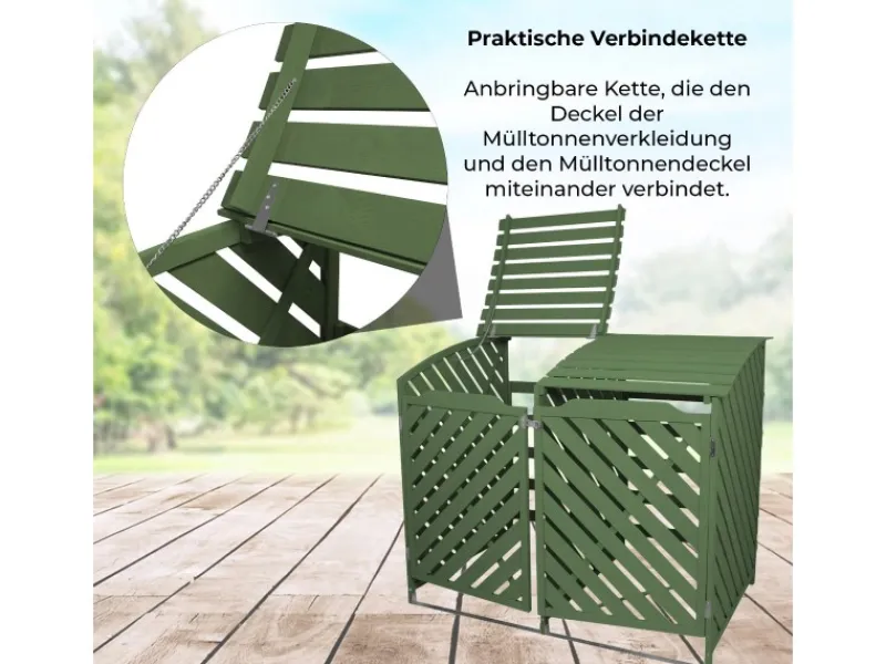 Mit dieser schönen Holz-Mülltonnenverkleidung von MonsterShop können Sie ein stilvolles Merkmal aus Ihren beiden sonst gewöhnlichen 240L-Behältern mit Rollen erstellen.Unsere Mülltonnenverkleidung ergänzt alle Außenbereiche und bietet Ihnen einen schönen Garten, während Ihre Mülltonnen immer noch an einem praktischen Ort aufbewahrt werden.Der Rahmen besteht aus starkem, langlebigem Douglasienholz und ist mit einem Lamellen-Design gebaut, dadurch kann die Luft durch den Bereich strömen und einen frischen Geruch durch Ihren Garten beibehalten.Die Mülltonnenverkleidung ist perfekt für die Lagerung von zwei Standard-Mülltonnen mit Rollen ausgelegt. Aber seine Vielseitigkeit zeigt sich auch bei der Lagerung anderer Gegenstände wie Brennholz oder Ihrer unverzichtbaren Gartengeräte.Die zwei großen Türen an der Vorderseite ermöglichen einen aüßerst einfachen Zugang, um das Entfernen der Mülltonnen zu einem Kinderspiel zu machen. Geschlossene Vordertüren ermöglichen das Anbringen eines Vorhängeschlosses für zusätzliche Sicherheit. Mit dem praktischen Befestigungsset können Sie die Mülltonnenverkleidung auch an einer Wand oder einem Zaun befestigen.Produktmerkmale:Starkes und langlebiges Holzlager für Mülltonnen.Perfekt für 2 x 240-Liter-Mülltonnen.Abschließbare Türen für Sicherheit.Praktische zugängliche Deckel.Kommt flach verpackt mit schnellem und einfachem Zusammenbau.Doppelt als Lagerung für Gartengeräte/Brennholz.Kostenloses Befestigungsset zur Befestigung an der Wand/am Zaun.Spezifikationen:Höhe: 1220mm / 122cm / 1.2mBreite: 1490mm / 149cm / 1.49mTiefe: 925mm / 92.5cm / 0.925mGewicht: 25 kgFarbe: SalbeigrünMaterial: FichtenholzStil: Outdoor, GartenMontage erforderlich: JaFlach verpackt: JaAnzahl der Türen: 2Anzahl der Schlösser: 2Kapazität: 2 x Mülltonnen mit RollenWas ist enthalten:Langlebige doppelte MülltonnenverkleidungKostenloses praktisches Befestigungsset
