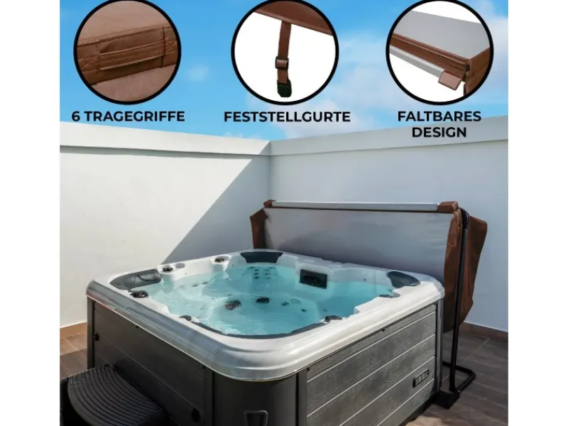 Diese Whirlpoolabdeckung vereint Funktionalität, Sicherheit und Stil und macht Ihr Whirlpoolerlebnis noch einfacher. Mit ihrer eleganten braunen Lederoberfläche passt sie mühelos zu jeder Außeneinrichtung und verleiht Ihrem Whirlpool einen Hauch von Eleganz.Die fachmännisch gefertigte Abdeckung besteht aus hochwertigem EPS-Schaumstoff mit hoher Dichte (25 kg/m3) und bietet das ganze Jahr über eine hervorragende Isolierung. Diese Konstruktion trägt dazu bei, die ideale Wassertemperatur für Ihren Whirlpool aufrechtzuerhalten, sodass er für Ihr nächstes entspannendes Bad bereit ist. Die außergewöhnliche Wärmespeicherung reduziert nicht nur die Betriebskosten des Whirlpools, sondern fördert auch ein angenehmes Whirlpool-Erlebnis.Mit ihren sechs strategisch platzierten Griffen lässt sich die Abdeckung problemlos anheben und abnehmen. Das faltbare Design erhöht die Benutzerfreundlichkeit zusätzlich, da die Abdeckung bei Nichtgebrauch viel einfacher zu handhaben und zu verstauen ist.Langlebigkeit steht bei der Konstruktion im Vordergrund, und die Abdeckung wird durch einen verzinkten C-Kanal verstärkt. Dies bietet strukturelle Unterstützung und verhindert ein Durchhängen oder Verziehen im Laufe der Zeit. Die Abdeckung besteht aus UV- und schimmelresistentem Vinyl in Marinequalität und hochwertigem PVC-Leder und ist damit bestens für den Einsatz unter extremen Bedingungen gerüstet, sodass sie das ganze Jahr über in einem tadellosen Zustand bleibt. Das spitz zulaufende Design sorgt dafür, dass Regenwasser direkt abläuft und sich keine Pfützen bilden.Für zusätzlichen Seelenfrieden ist die Abdeckung mit kindersicheren Verriegelungsriemen mit Schlüssel ausgestattet. Diese strapazierfähigen Gurte sorgen dafür, dass die Abdeckung sicher und fest auf Ihrem Whirlpool sitzt, was zu einer sicheren Umgebung beiträgt und die Wärme besser speichert.Diese Whirlpoolabdeckung ist der ideale Begleiter für Ihren Whirlpool und sorgt für ein durchweg angenehmes und problemloses Erlebnis.Produktmerkmale:– UV- und schimmelresistentes Marinequalität Oberseite aus Vinyl- 4 x kindersichere Verschlussriemen mit Schlüssel- 6 x strapazierfähige Griffe- Hochdichter, isolierter EPS-Schaum (25kg/m3)- Verzinkte C-KanäleSpezifikationen:– Farbe: Braun- Höhe: 10 cm / 0,10 m- Breite: 210cm / 2,1m- Tiefe: 210 cm / 2,1m- Gewicht: 18.7kg- Materialien: PVC-Leder, EPS-Schaum, Kunststoff, verzinktes Eisen, Oberseite aus Marinequalität-Vinyl- Ausführung: Braunes PVC-Leder mit Oberseite aus Marinequalität-Vinyl- Art der Isolierung: EPS-Schaumstoff- EPS-Schaumstoff Dichte: 25kg/m3- Schwer entflammbar und feuerhemmend: Ja- Anzahl der Griffe: 6- Anzahl der Lockdown-Gurte: 4Im Lieferumfang enthalten:– 1 x Whirlpool Abdeckung