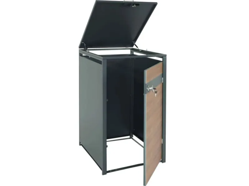 Diese Mülltonnenverkleidung überzeugt durch modernes Design, praktische Funktionen und hohe Sicherheit. Dank der Gasdruckfedern lassen sich die Deckel einfach öffnen, während die separate Abschließbarkeit der Türen und Deckel Deine Mülltonnen zuverlässig schützt. Die Belüftungsschlitze sorgen dafür, dass Kondenswasser vermieden wird, und die wetterfeste Pulverbeschichtung garantiert Langlebigkeit. Ideal, um Deinen Außenbereich sauber und ordentlich zu gestalten.