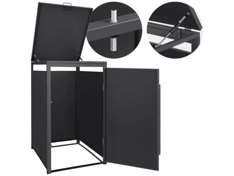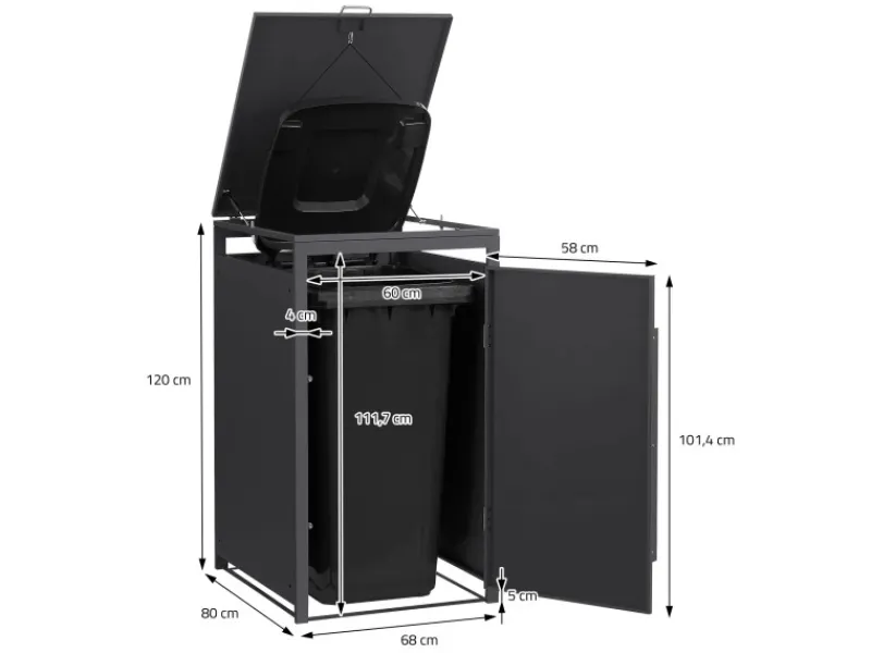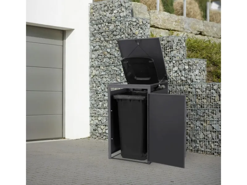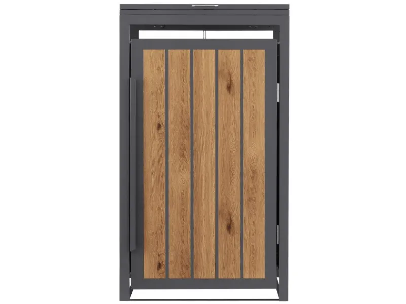 Diese Mülltonnenbox besteht aus Stahlblech und einem Rahmen, wodurch sie äußerst robust und rostfrei ist. Zudem erhält die Mülltonnenbox eine Pulverbeschichtung mit Struktur im Farbton Anthrazit-Eiche hell.