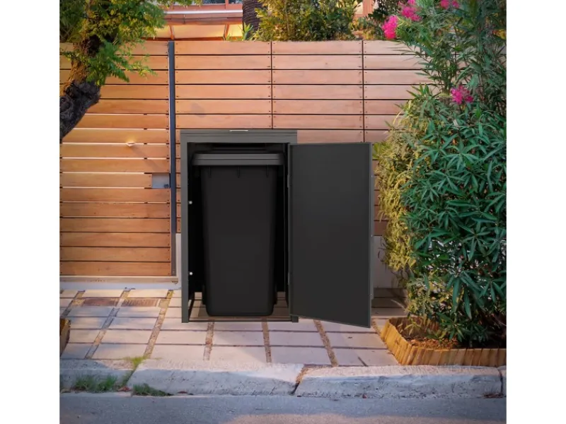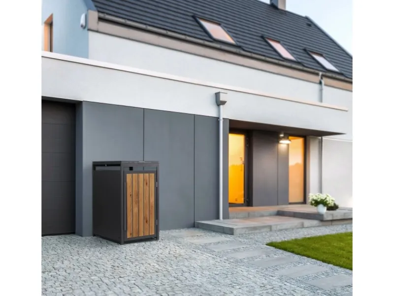Mülltonnen im Eingangsbereich machen oftmals keine schöne Figur. Mit den praktischen Mülltonnenboxen hast du eine smarte und komfortable Lösung, die unschönen Mülltonnen verschwinden zu lassen. Es passen alle gängigen Mülltonnen von 60 Liter, 120 Liter oder 240 Liter.