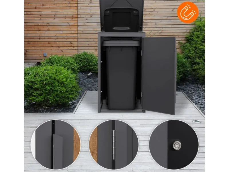 Das hohle Design bietet eine gute Luftzirkulation und verhindert schlechte Gerüche in der Müllbox. Ein Magnetverschluss an der Tür hält die Box zuverlässig verschlossen und sorgt für ein gepflegtes Gesamtbild. Zur Bodenbefestigung besitzt die Mülltonnenbox an der Links- und Rechtsseitige ein Bodenblech mit vorgebohrten Löcher.