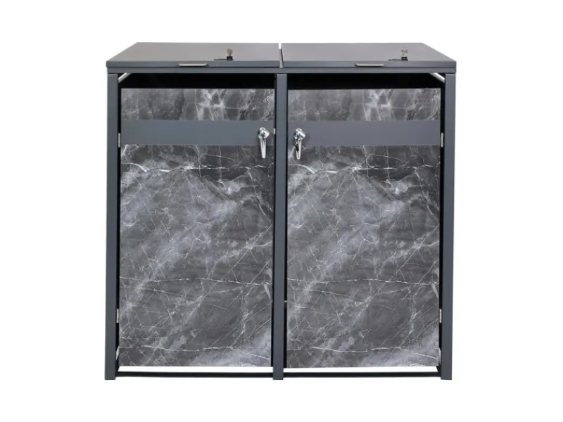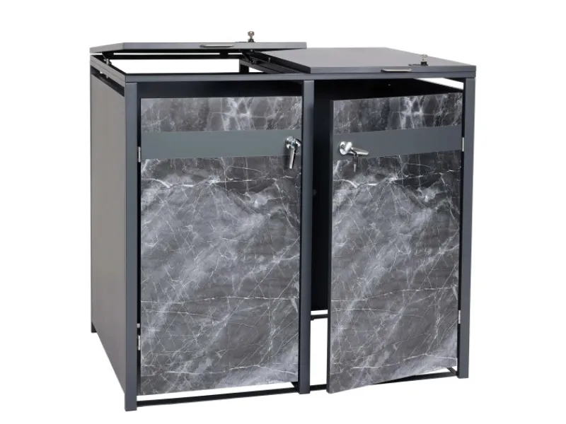 Diese Mülltonnenverkleidung überzeugt durch modernes Design, praktische Funktionen und hohe Sicherheit. Dank der Gasdruckfedern lassen sich die Deckel einfach öffnen, während die separate Abschließbarkeit der Türen und Deckel Deine Mülltonnen zuverlässig schützt. Die Belüftungsschlitze sorgen dafür, dass Kondenswasser vermieden wird, und die wetterfeste Pulverbeschichtung garantiert Langlebigkeit. Ideal, um Deinen Außenbereich sauber und ordentlich zu gestalten.