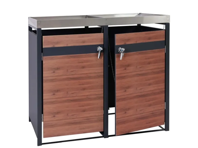 Diese Mülltonnenverkleidung überzeugt durch modernes Design, praktische Funktionen und hohe Sicherheit. Dank der Gasdruckfedern lassen sich die Deckel einfach öffnen, während die separate Abschließbarkeit der Türen und Deckel Deine Mülltonnen zuverlässig schützt. Die Belüftungsschlitze sorgen dafür, dass Kondenswasser vermieden wird, und die wetterfeste Pulverbeschichtung garantiert Langlebigkeit. Ideal, um Deinen Außenbereich sauber und ordentlich zu gestalten.