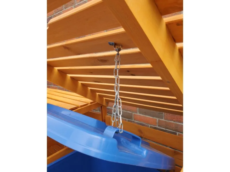 Die Mülltonnenbox ist mit einer praktischen Funktion ausgestattet. Mithilfe einer Kette kann der Deckel des Mülleimers gleichzeitig mit der Klappe der Abdeckung hochgehoben werden. So können Sie diesen einhändig bedienen und müssen die Müllbeutel nicht vor dem Öffnen der Mülltonne abstellen.