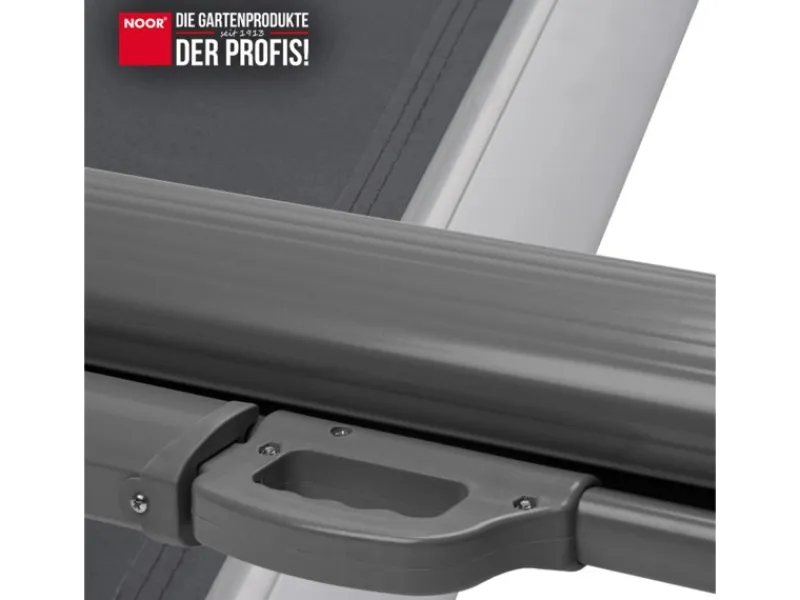 Das Gewebe ist UV-strahlenbeständig, was bedeutet, dass es auch bei direkter Sonneneinstrahlung seine strukturelle Integrität bewahrt und nicht reißt oder porös wird. Bitte beachten Sie jedoch, dass die Farbbeständigkeit von der UV-Beständigkeit getrennt betrachtet wird. Bei längerer direkter UV-Bestrahlung können sichtbare farbliche Veränderungen, insbesondere ein Ausbleichen, auftreten. Das Gestell der Seitenmarkise ist in Grau pulverbeschichtet, und das Befestigungsmaterial ist im Lieferumfang enthalten.